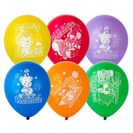 Шар латексный шелкография 12 /30см С Днем рождения! Зверюшки ассорти из 6 цветов, 5 дизайнов