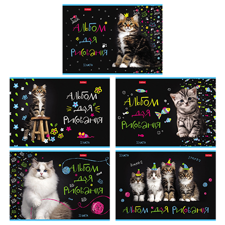 Альбом А4 32л Hatber Мурчат коты (ассорти), на скобе, обложка- мелованный картон, блок- офсет 100г/м2, 1 дизайн в спайке, 5 дизайнов в коробке