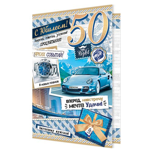 Открытка Мир открыток 2-46 С Юбилеем! Мужская- 50лет Автомобиль, горы, 251*194мм, блестки, рельеф, текст