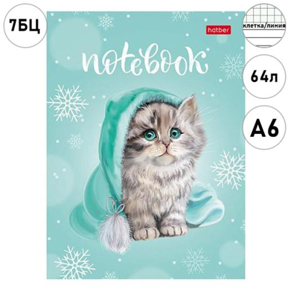 Записная книжка МАЛЫЙ ФОРМАТ А6 7БЦ 64л Hatber Милый котик, клетка/линия, сшивка, обложка - матовый ламинированный картон