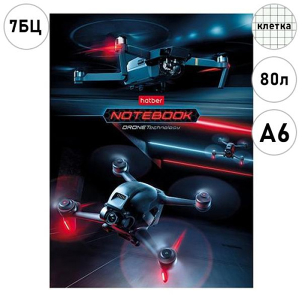 Записная книжка МАЛЫЙ ФОРМАТ А6 7БЦ 80л Hatber Drone, клетка, сшивка, обложка - глянцевый ламинированный картон