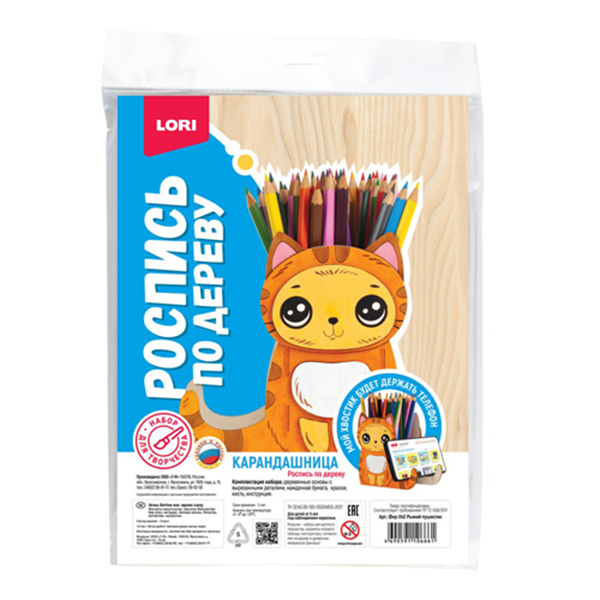 Роспись по дереву Lori Карандашница. Рыжий пушистик, в наборе: деревянная заготовка, краски, наждачная бумага, кисть, инструкция, пакет с европодвесом