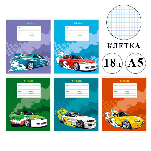 Тетрадь А5 18л клетка Эксмо Гонка, офсет, на скобе, обложка - мелованный картон, выборочный УФ-лак, 5 дизайнов в коробке