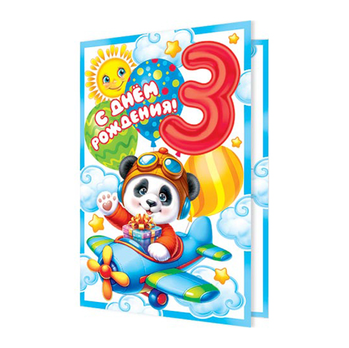 Открытка Мир открыток 2-46 С Днем рождения! 3года Детская- Панда на самолете, 251*194мм, блестки, рельеф, пластизоль, текст