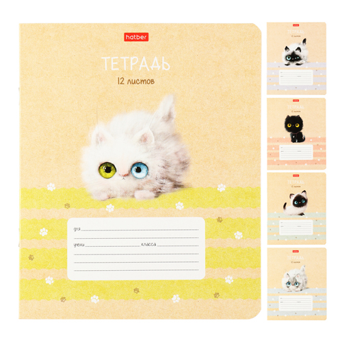 Тетрадь А5 12л косая линия с дополнительной горизонтальной Hatber Кошарики, офсет, на скобе, обложка - мелованный картон, скругленные углы, 5 дизайнов в спайке