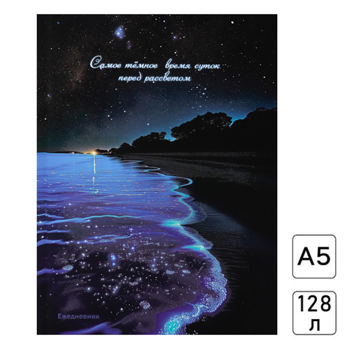 Ежедневник недатированный А5 150*204мм 7БЦ Проф-Пресс 128л Светящееся побережье, линия, мелованный картон, ламинация soft-touch, глянцевый песок, белый офсет, справочная информация