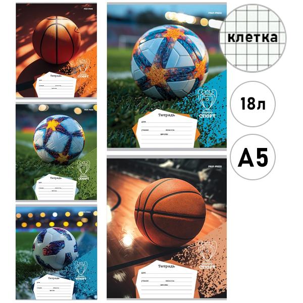 Тетрадь А5 18л клетка Проф-Пресс Разные мячи-2, офсет, на скобе, обложка - мелованная бумага, 5 дизайнов в спайке