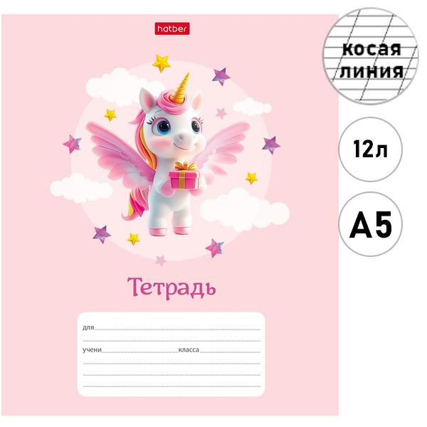 Тетрадь А5 12л косая линия Hatber Крылатые единорожки, офсет, на скобе, обложка- мелованный картон, скругленные углы, 5 дизайнов в спайке