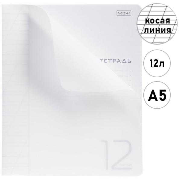 Тетрадь с пластиковой обложкой А5 12л косая линия Hatber Белая, офсет, на скобе, 1 дизайн в коробке
