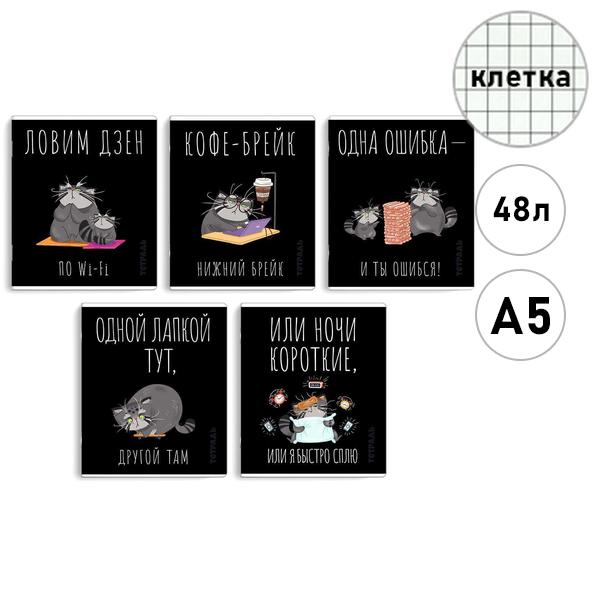 Тетрадь А5 48л клетка Феникс Серый кот, офсет, на скобе, обложка - мелованный картон, выборочный твин-лак, скругленные углы, 5 дизайнов в спайке
