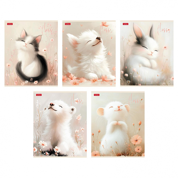 Тетрадь А5 48л клетка Hatber Flossy, офсет, на скобе, обложка - мелованный картон, ламинация soft-touch, скругленные углы, запечатанный оборот, цветной титульный лист, 5 дизайнов в спайке