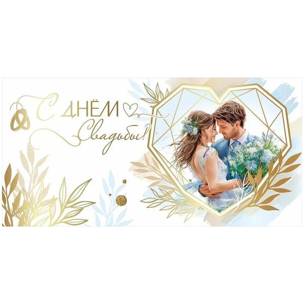 Конверт для денег Праздник 445 Свадьба- С Днем Свадьбы! Жених и невеста, сердце, 168*84мм, золотая фольга, текста