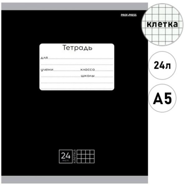 Тетрадь А5 24л клетка Проф-Пресс Классика Черная, офсет, на скобе, обложка - мелованная бумага, 1 дизайн в коробке