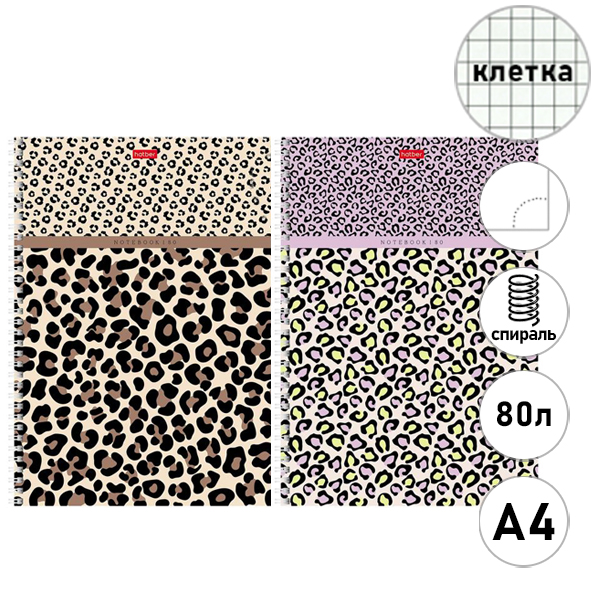 Тетрадь спираль А4 80л клетка Hatber Leo-принт, офсет, обложка - мелованный картон, перфорация, 2 дизайна в спайке