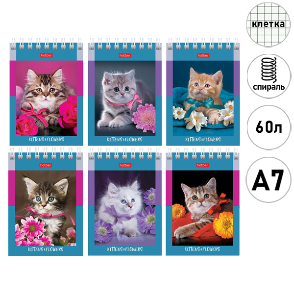 Блокнот МАЛЫЙ ФОРМАТ А7 спираль сверху 60л Hatber На мягких лапках (ассорти), клетка, обложка - мелованный картон, 6 дизайнов
