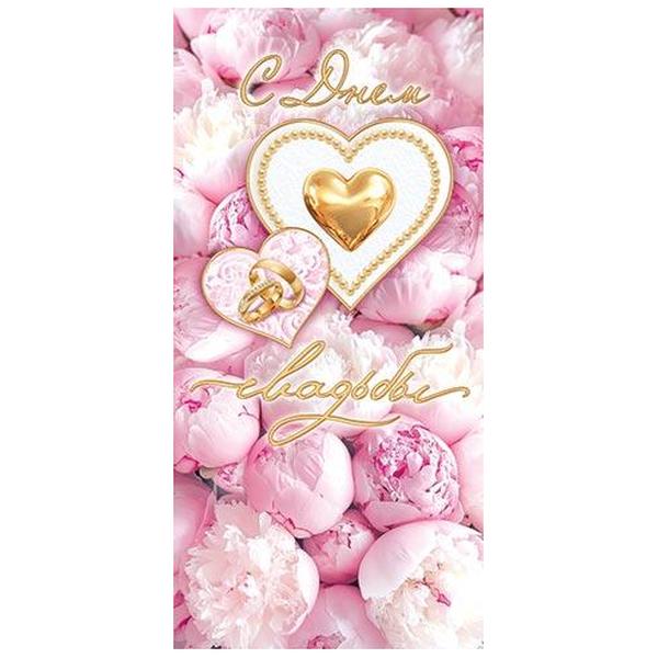 Конверт для денег Мир открыток 2-16 Свадьба- С Днем Свадьбы! Розовые пионы, сердце, кольца, 83*168мм, золотые блестки, без текста
