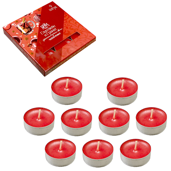 Свеча чайная Новогодняя ароматизированная РСМ 9шт Глинтвейн и гранат, 39*12,5мм время горения 3-4часа, картонная упаковка
