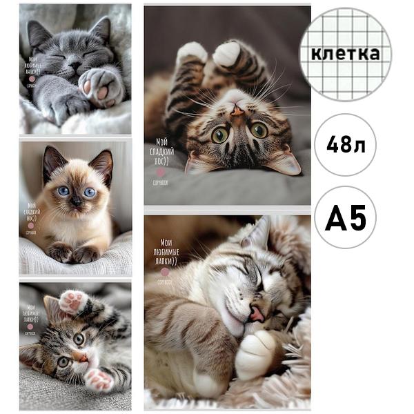 Тетрадь А5 48л клетка Проф-Пресс Милые котики-5, на скобе, обложка - мелованная бумага, 5 дизайнов в спайке
