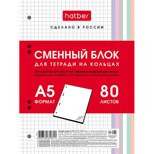 Сменный блок А5 80л клетка Hatber офсет, универсальная перфорация на 6 отверстий, многоцветный срез, индивидуальная упаковка