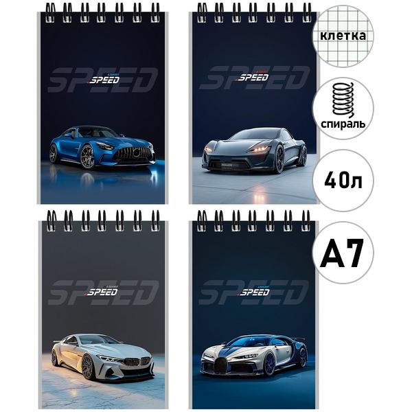 Блокнот МАЛЫЙ ФОРМАТ А7 спираль сверху 40л Проф-Пресс Красивые автомобили- 8, клетка, обложка - мелованный картон, 4 дизайна
