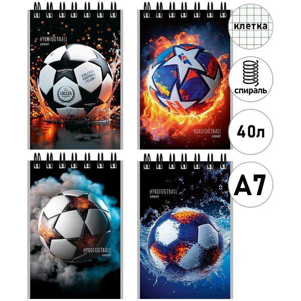 Блокнот МАЛЫЙ ФОРМАТ А7 спираль сверху 40л Проф-Пресс Разные футбольные мячи- 14, клетка, обложка - мелованный картон, 4 дизайна