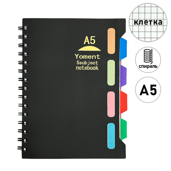 Тетрадь с пластиковой обложкой спираль А5 108л клетка KWELT Shenghang черная, офсет, 4 цветных разделителя, 1 дизайн в коробке