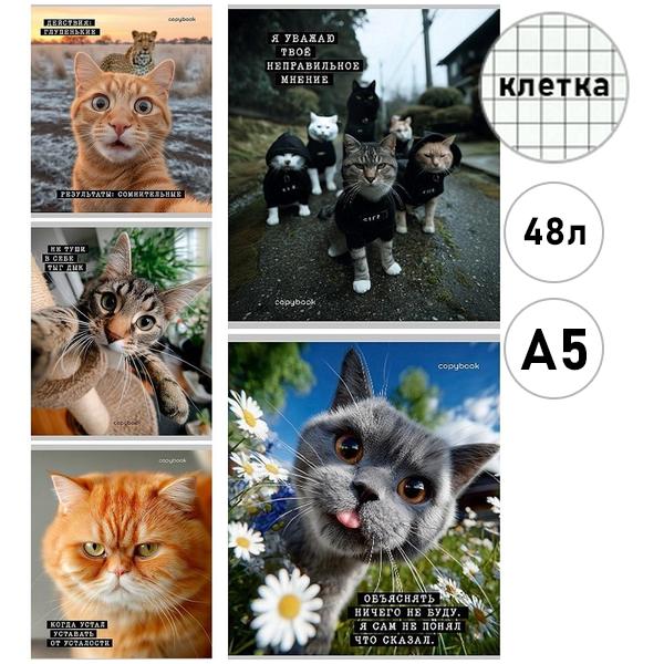 Тетрадь А5 48л клетка Проф-Пресс Коты-мемы, офсет, на скобе, обложка - мелованный картон, 5 дизайнов в спайке