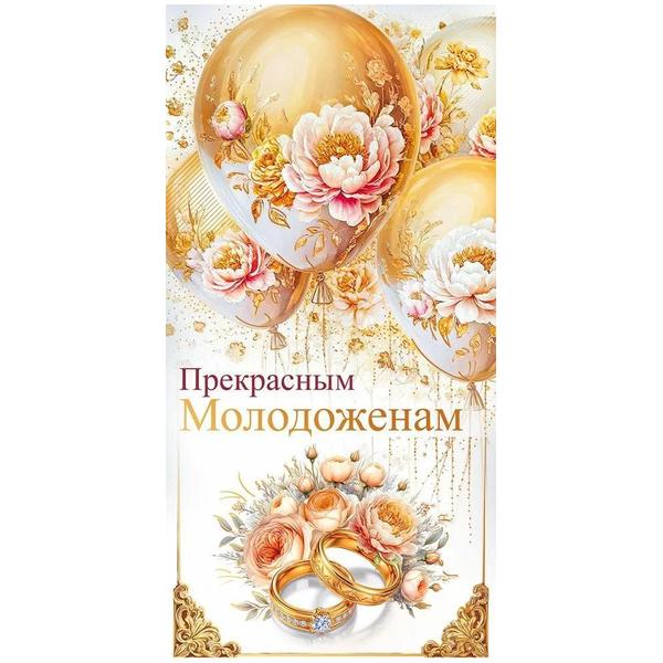 Конверт для денег Мир поздравлений 445 Свадьба- Прекрасным молодоженам, кольца, цветы, шары, 84*168мм, золотая фольга, текст