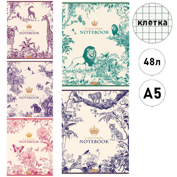 Тетрадь А5 48л клетка Hatber Царство джунглей, офсет, на скобе, обложка - мелованный картон, ламинация soft-touch, тиснение, скругленные углы, 5 дизайнов в спайке
