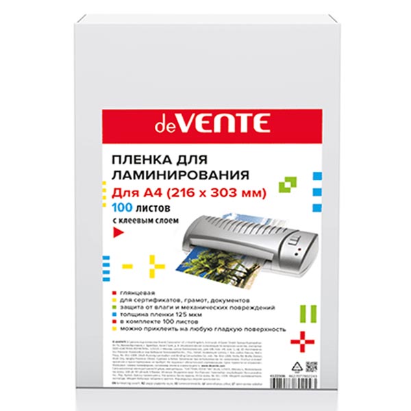 Пленка для ламинирования с клеевым слоем deVente А4 0,125мм, глянцевая, 100л, 216*303мм
