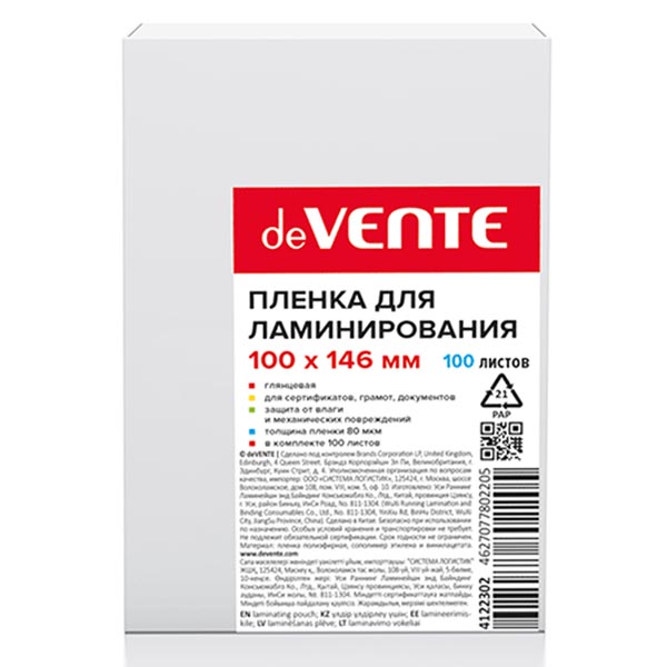 Пленка для ламинирования deVente А6 0,08мм, глянцевая, 100л, 100*146мм