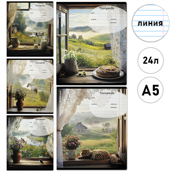 Тетрадь А5 24л линия Erich Krause Countryside, Mix-pack, офсет, на скобе, обложка - мелованный картон, скругленные углы, 5 дизайнов в спайке