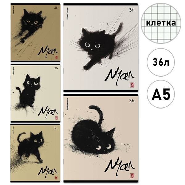 Тетрадь А5 36л клетка Erich Krause Blur Cat, Mix-pack, офсет, на скобе, обложка - мелованный картон, скругленные углы, 5 дизайнов в спайке
