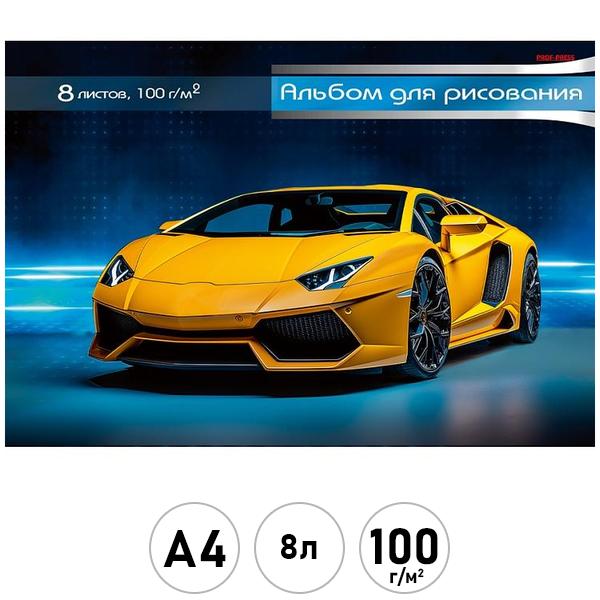 Альбом А4 8л Проф-Пресс Желтое спортивное авто- 1, на скобе, обложка- мелованная бумага, блок- офсет 100г/м2, 1 дизайн в коробке