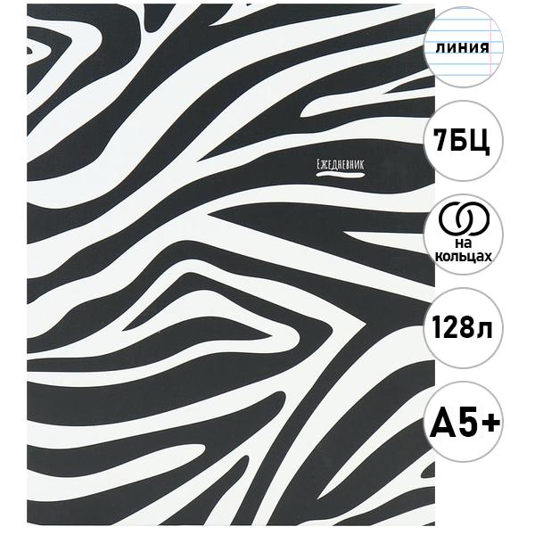Ежедневник недатированный А5+ 172*220мм 7БЦ на кольцах Проф-Пресс 128л Принт зебры, линия, мелованный картон, матовая ламинация, лен, белый офсет, печать в 1 краску, справочная информация