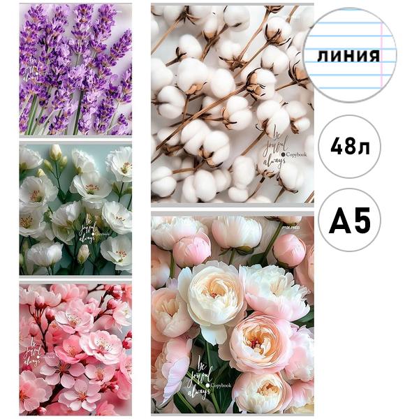 Тетрадь А5 48л линия Проф-Пресс Нежные цветы-21, офсет, на скобе, обложка- мелованный картон, 5 дизайнов в спайке