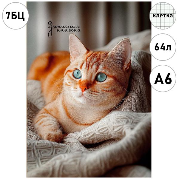 Записная книжка МАЛЫЙ ФОРМАТ А6 7БЦ 64л Проф-Пресс Фото котика-2, клетка, обложка - глянцевый ламинированный картон, сшивка, офсет