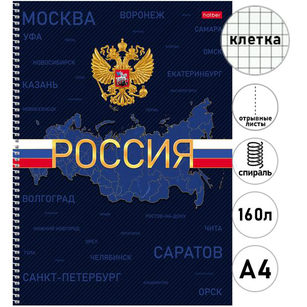 Тетрадь спираль А4 160л клетка Hatber Россия, офсет, обложка - мелованный картон, глянцевая ламинация, перфорация, 1 дизайн в коробке