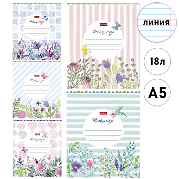 Тетрадь А5 18л линия Hatber Watercolor, офсет, на скобе, обложка - мелованный картон, скругленные углы, 5 дизайнов в спайке