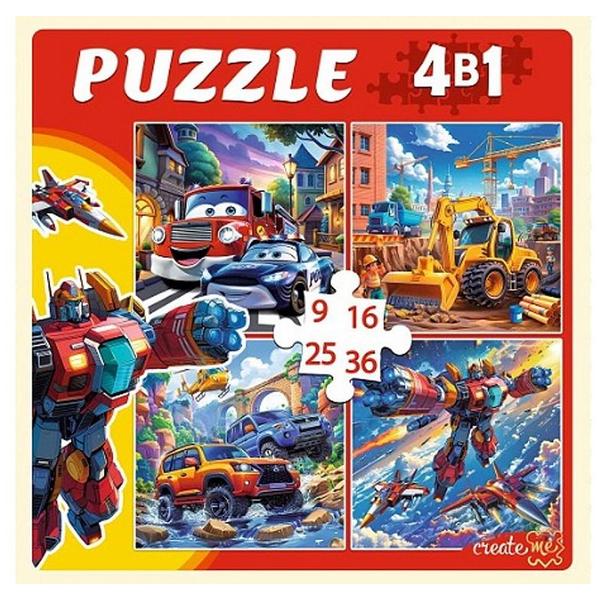 Пазлы Рыжий кот 4в1 Машины и роботы (9,16,25,36) элементов 15*15см, картонная упаковка 18,2*17,7*5,5см