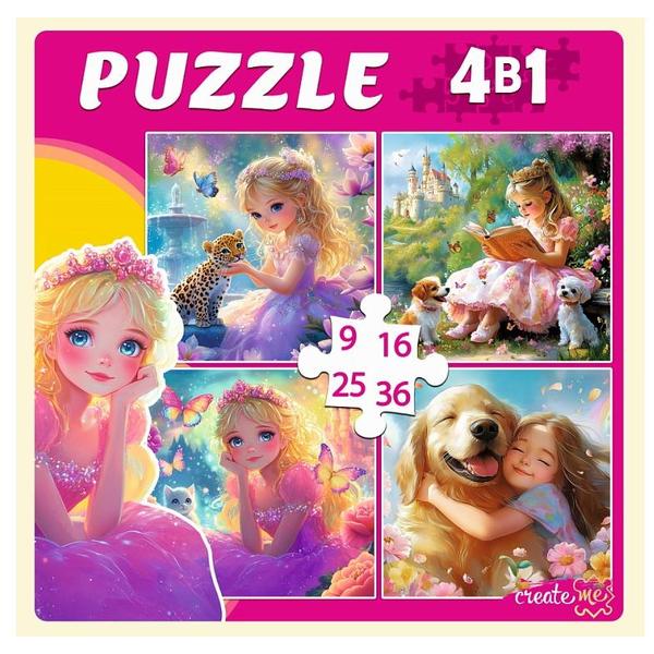 Пазлы Рыжий кот 4в1 Принцессы с любимыми животными (9,16,25,36) элементов 15*15см, картонная упаковка 18,2*17,7*5,5см