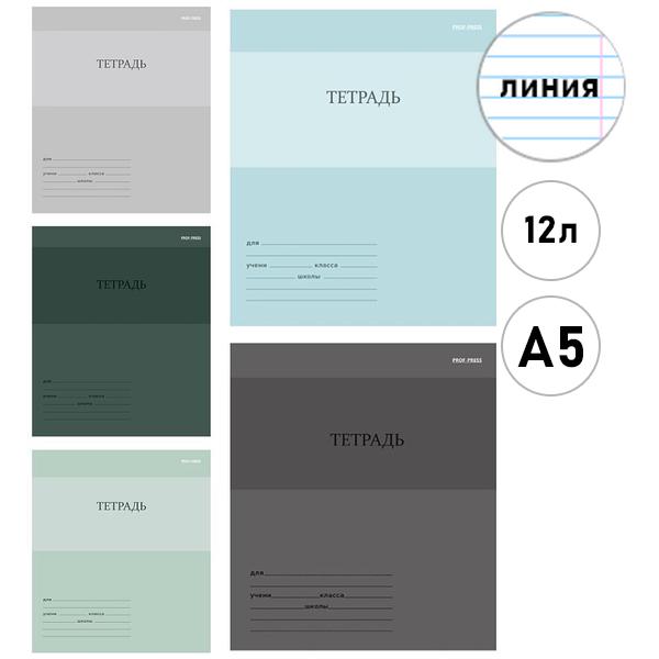 Тетрадь А5 12л линия Проф-Пресс Однотонный дизайн-3, офсет, на скобе, обложка - мелованная бумага, 5 дизайнов в спайке