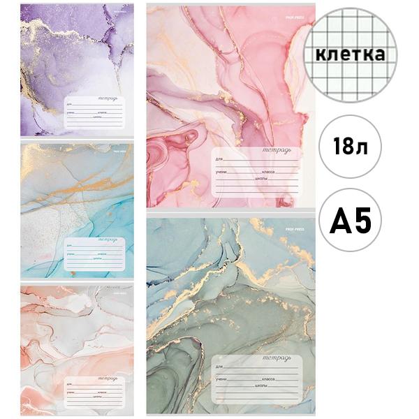 Тетрадь А5 18л клетка Проф-Пресс Мраморный дизайн, офсет, на скобе, обложка - мелованная бумага, 5 дизайнов в спайке