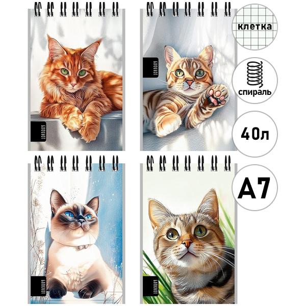 Блокнот МАЛЫЙ ФОРМАТ А7 спираль сверху 40л Проф-Пресс Нарисованные котики, клетка, обложка - мелованный картон, 4 дизайна