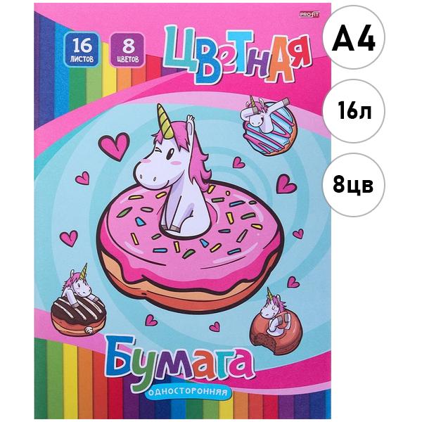 Бумага цветная А4 немелованная, 16л 8цв Проф-Пресс Единороги и пончики, на скобе