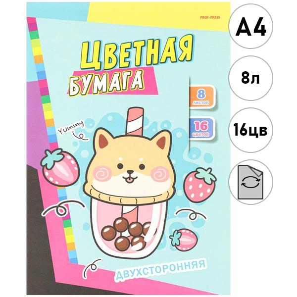 Бумага цветная А4 немелованная, двухсторонняя, 8л 16цв Проф-Пресс Необычные сладости, на скобе