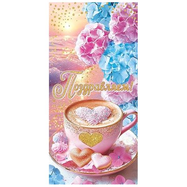 Конверт для денег Мир открыток 2-16 Поздравляем! Розовая чашка с кофе на блюдце, сердечки, цветы, 83*168мм, рельеф, золотые блестки, без текста
