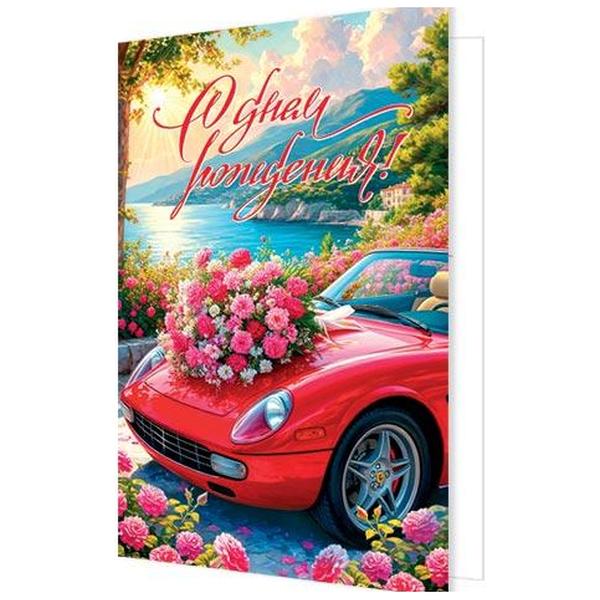 Открытка Мир открыток 2-04 С Днем рождения! Нежный букет, красное авто, 126*194мм, без отделки, текст