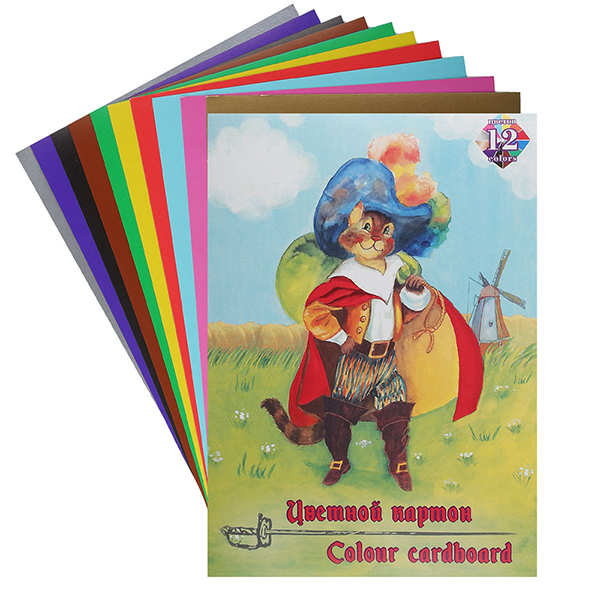 Картон цветной А4 мелованный, 12л 12цв Лилия Холдинг Кот в сапогах, 200г/м2, в папке