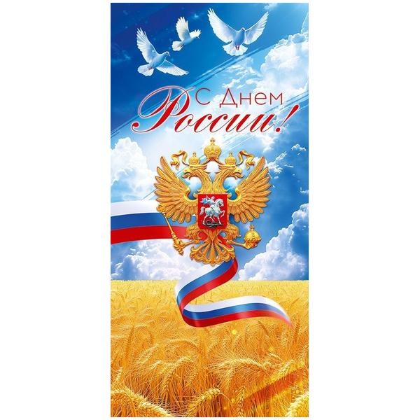 Открытка Открытая планета 410 Евро Официальная- С Днем России! Госсимволика, голуби, поле колосьев, 97*204мм, глянцевый УФ-лак